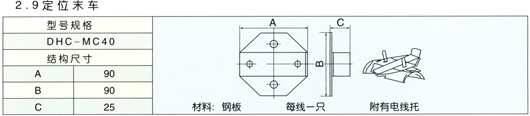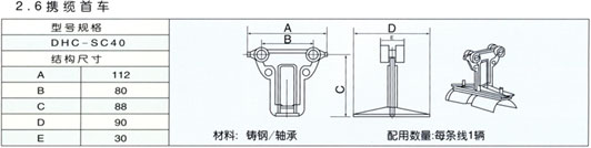 DHC系列電纜車線由滑軌(C型槽管)、支架、懸吊夾、連接夾套、攜纜首車、攜纜小車、撥叉、定位末車、封頭等組成。該系列產(chǎn)品平整美觀、安全可靠,安裝簡捷,適用于有防爆技術(shù)要求和一切必需用軟電纜移動(dòng)供電的系統(tǒng),如煙草、水廠、港口、礦山等部門。